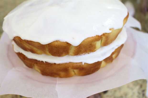 Cuando la torta esté completamente fría, aplique una capa delgada de escarcha en una mitad de la torta y lugar de la segunda mitad encima de la cubierta. Pastel entero de Frost con helar más.