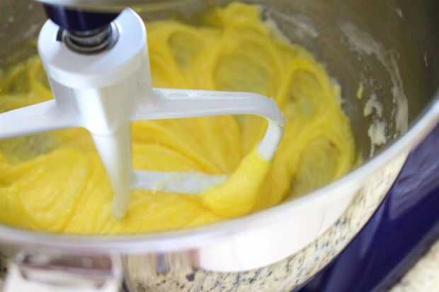 En un tazón grande, batir el azúcar, el aceite y la mantequilla. Añadir las yemas de huevo, uno a uno y batir bien. Golpe en el extracto de vainilla.