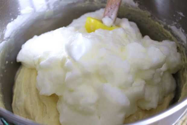 Doble las claras de huevo a la masa de tarta en tres adiciones, doblando suavemente después de cada uno.