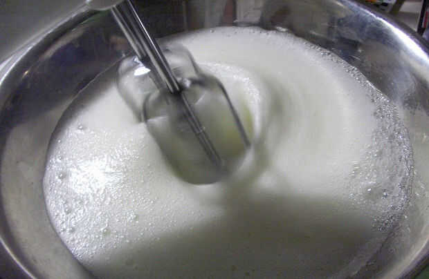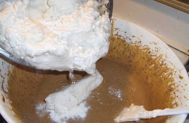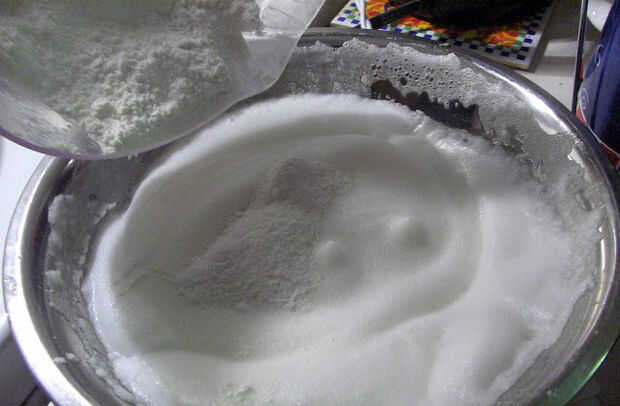 En otro tazón, bata las claras de huevo hasta montarla luego doblar en harina un poco a la vez, doblándola ligeramente