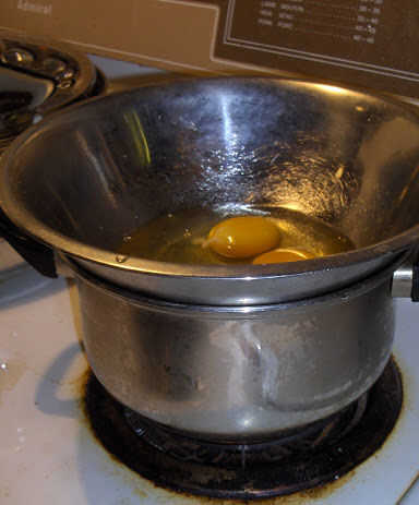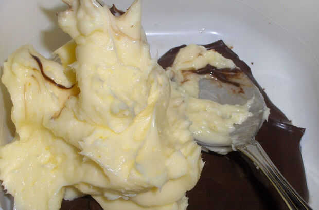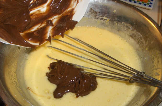 Derretir chocolate y mantequilla y luego agregar huevos tibios