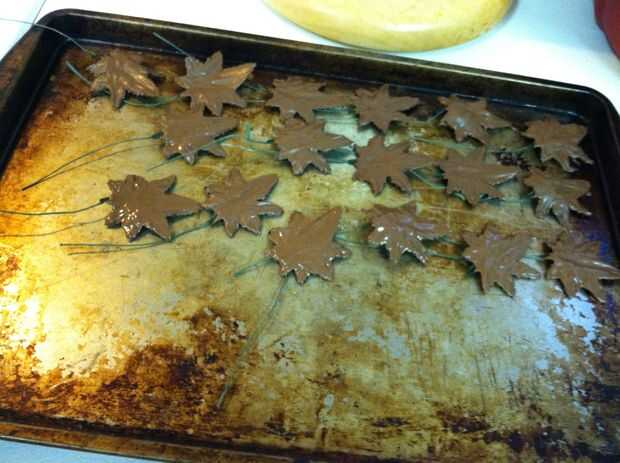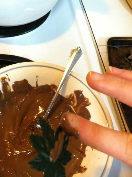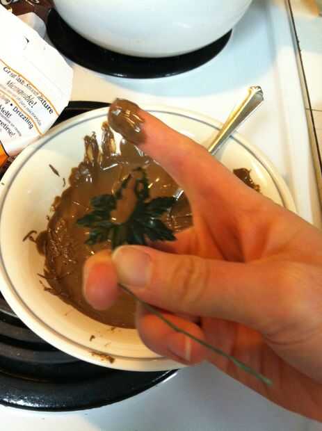 Recoger una hoja artificial, meter el dedo índice de su mano libre en el chocolate del derretimiento. Cubrir la hoja con el chocolate, quiere asegurarse de que el chocolate es grueso por lo que será más fácil sacar la hoja artificial. Intente su mejor para conseguir sólo el chocolate en un lado de la hoja y no en el cable. Si chocolate vueltas al otro lado va a estar bien, sólo más difícil quitar la hoja artificial sin romper el chocolate. Como se imaginarán hojas de chocolate son muy delicados, como hojas.