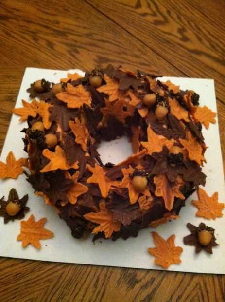 Ahora puede obtener su bunt cake. Aplicar hielo a tu pastel, recomendamos teñir el glaseado naranja o marrón para un pastel de acción de gracias y verde para un pastel de Navidad. La guinda es el "pegamento" que sostienen las hojas en el pastel. Una vez que el pastel está congelado completamente puede empezar a pegar deje a él. Al azar puse hojas donde nunca quise, aunque probé a difundir hacia fuera para que las hojas de naranja fueron distribuidas uniformemente entre el marrón.