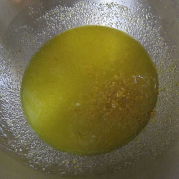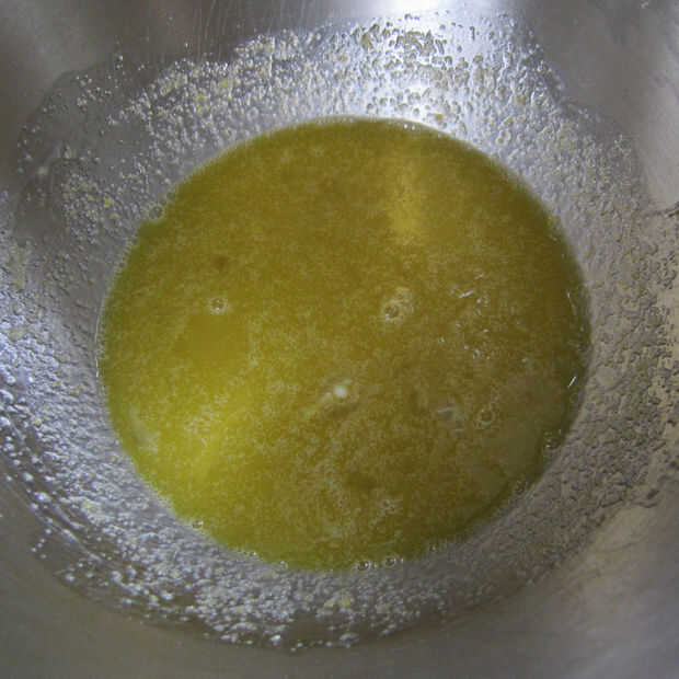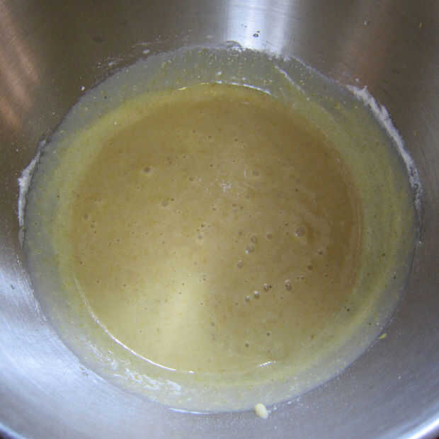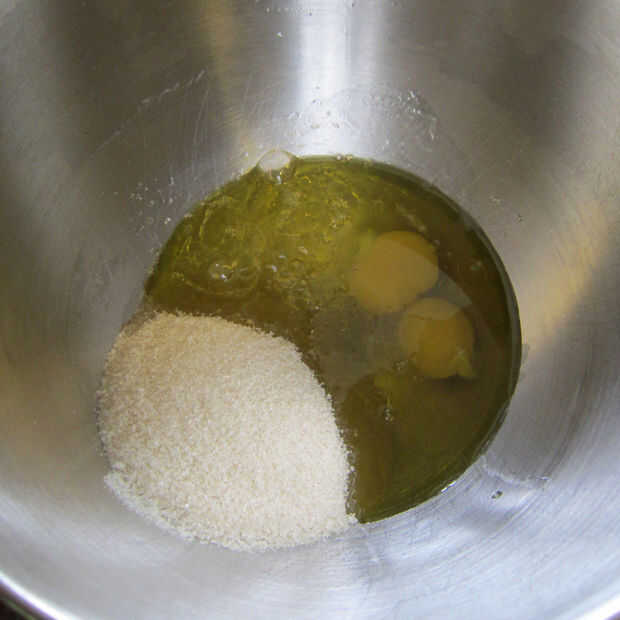 En el recipiente de una batidora con accesorio paleta combinan aceite de oliva, vino, azúcar y huevos a velocidad media hasta completamente lisa.