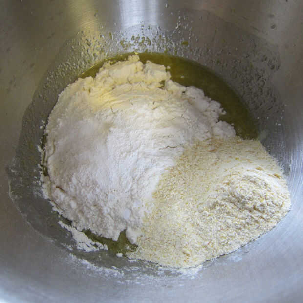 Añadir harina de maíz, harina, polvo de hornear, sal, limón y ralladura y mezclar (baja velocidad) unos 30 segundos o hasta que los ingredientes se incorporen bien. Gire a la mixer apagado y chatarra por lados. Ponga la batidora en medio y mezcla durante aproximadamente dos minutos.