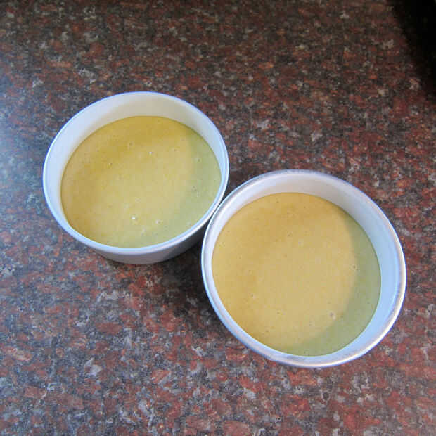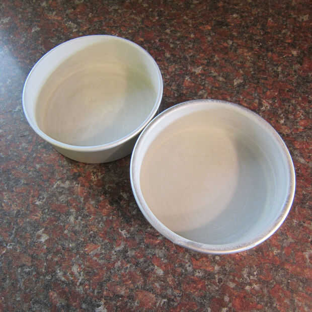 Batidora en marcha, mantequilla y dos de flores alrededor de seis pulgadas sartenes.