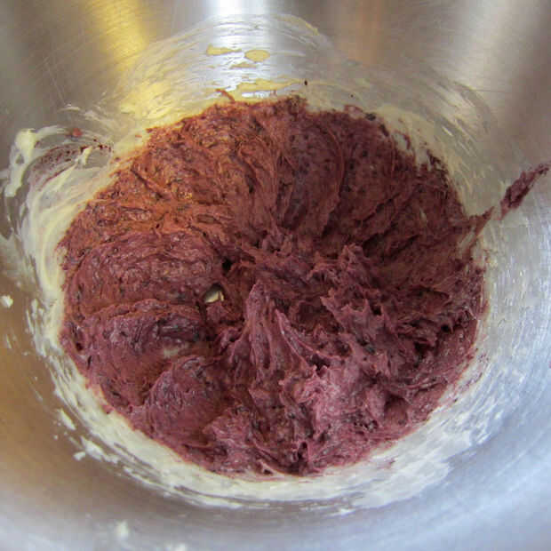 En el recipiente de una batidora equipado con accesorio batidor crema 8 cucharadas de mantequilla hasta que luz en color. Añadir reducción de balsámico de arándanos y mezclar hasta combinar bien. Agregar azúcar en polvo una taza a la vez.