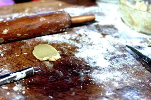 En cuanto a trabajo, cortar las galletas de las formas apropiadas fue la más ardua tarea. La masa era pegajosa, y vierte harina en mis galletas para hacer la masa manejable para moldear. En lugar de galletitas, terminé con galletitas de la harina.