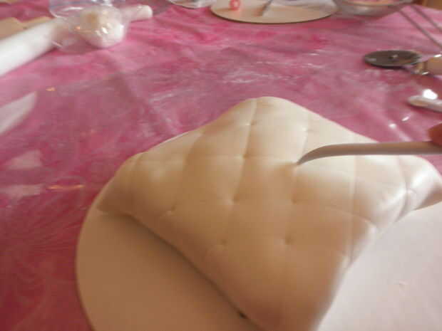 Extienda el fondant en el color de su elección (mina aerografiado en el final) la torta cubierta con fondant. Inmediatamente use una parte trasera de un pincel o una herramienta de pastillaje o esta práctica rueda de Wilton y dibujar un patrón acolchado sobre el fondant. También puedes hacer pequeñas marcas en la esquina de cada diamante.