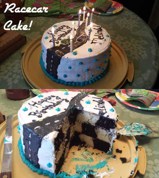 Mi prima Melinda convertido recientemente ocho (dato curioso: fue sólo 4 minutos de haber nacido en el 1:23 en 4, 5 y 6), y mi madre le rogó a hacer un pastel para ella. Ella realmente ama carreras, o así que mi madre me dijo, así que decoré un pastel que, cuando el corte abierto, parecía una bandera de la raza.