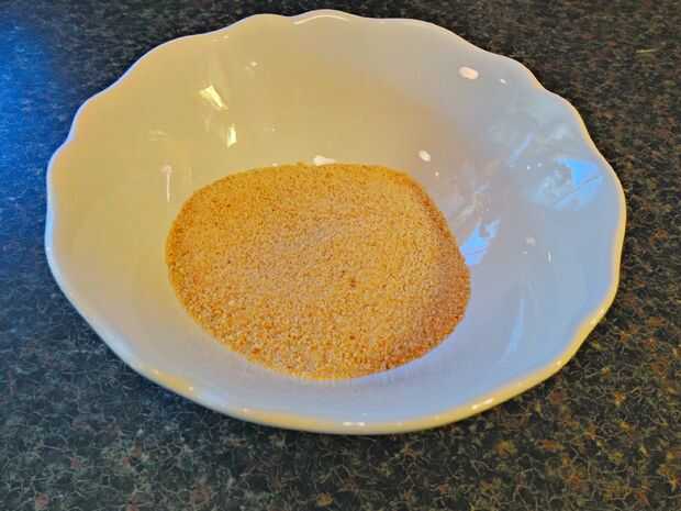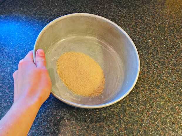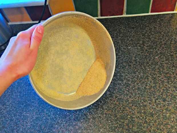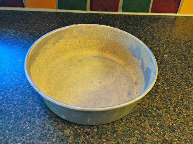 El pan de pastel de mantequilla para la torta sale después de la cocción. Poner pan rallado en la torta de pan y muévelo alrededor así que todo está cubierto.