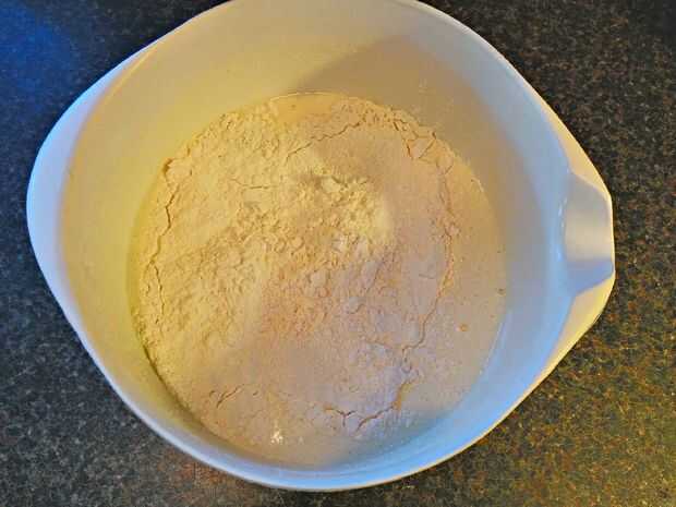Añadir 1,2 tazas de harina, 2 cucharaditas de polvo para hornear, 2 cucharaditas de vainilla en polvo en el recipiente mismo. Mezclarlo todo y ponerlo en el recipiente principal. Mezcla todo con una espátula.