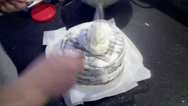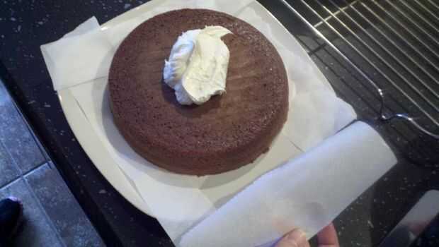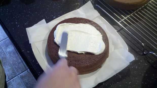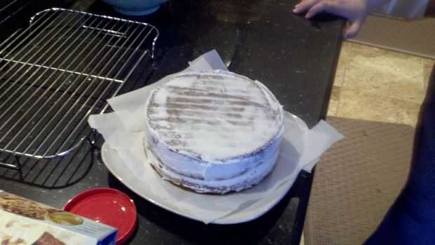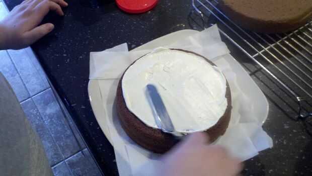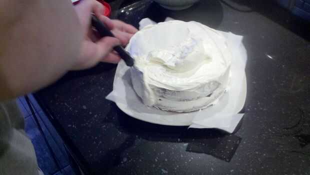 Si haces una torta de varias capas como yo lo hice, aplique una capa moderada de glaseado en el pastel de primera y luego coloque el otro boca abajo otra vez, a la primera.