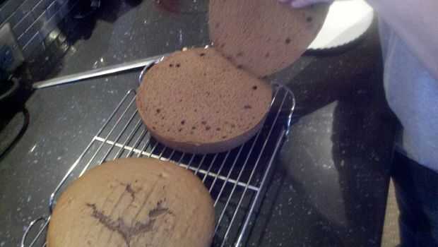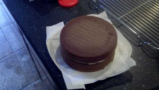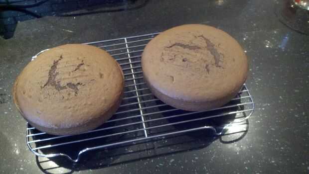 Utilicé una mezcla de torta de chocolate con leche en caja de la tienda de comestibles. Bien... Mi marido hizo. Lo intenté y en mal estado el pastel tan malo que nadie quiso comer, por lo que tuvo que hacer otro. Él utiliza dos moldes de 8 pulgadas, pero el tamaño es realmente suya.