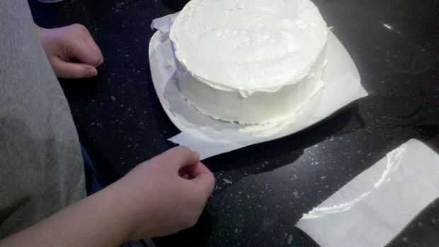 Terminar cubriendo la tarta con el glaseado, luego suavemente tire del papel hacia fuera debajo de él.
