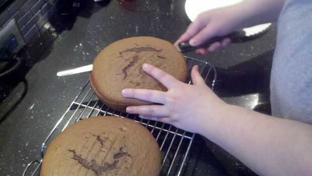 Deje que el pastel se enfríe completamente, luego nivelar la parte superior con un cuchillo de sierra largo.