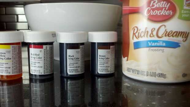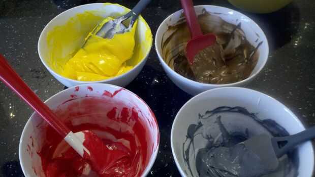 Separar el glaseado en un recipiente separado para cada color. Ir con helar un poco más lo que crees que se necesita para que pueda color una vez y no tener que tratar de emparejar el color cuando lo necesite más adelante.