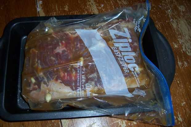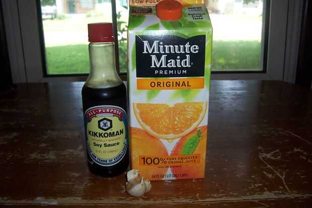 Coloque la carne en una bolsa resellable y añadir el zumo de naranja, ajo picado y salsa de soja.  Coloque la bolsa en un molde para pasteles, de manera que los jugos pueden repartidas uniformemente en la carne.  Ahora para la parte más difícil, dejar la carne macerar en el frigorífico durante 6-8 horas o incluso durante la noche. Si recordáis, voltee la bolsa a medio camino a través, pero no se moleste en levantarse en medio de la noche.