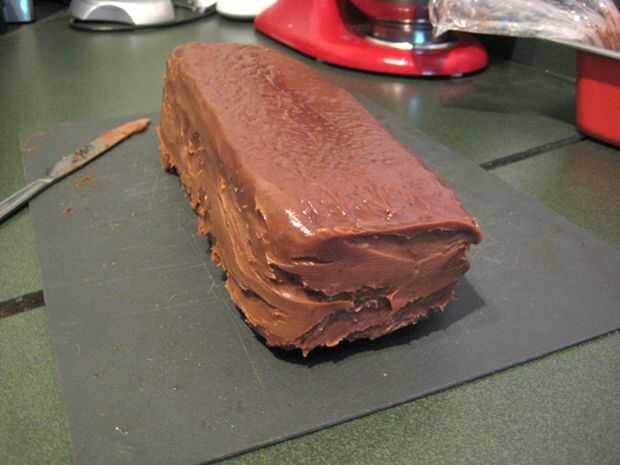 Una vez el pastel haya tenido tiempo de configurar y ya no es totalmente líquido chocolate, retire de la sartén, lo desenvuelva y cortar en rodajas con un cuchillo de hoja lisa.