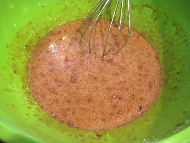 Mientras tanto, en un tazón mediano/grande batir los huevos y la vainilla. Mezcla el azúcar con sabor a chocolate. Batirlo hasta que esponje.