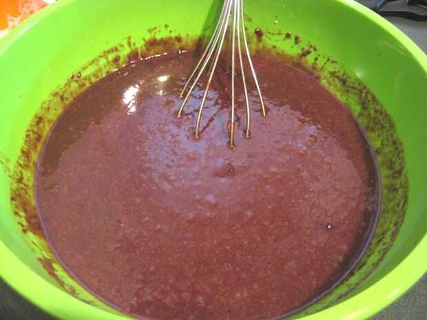 Cuando el chocolate y la mantequilla se derritan completamente Vierta el chocolate derretido en la mezcla de huevo/azúcar. Mezclar bien.