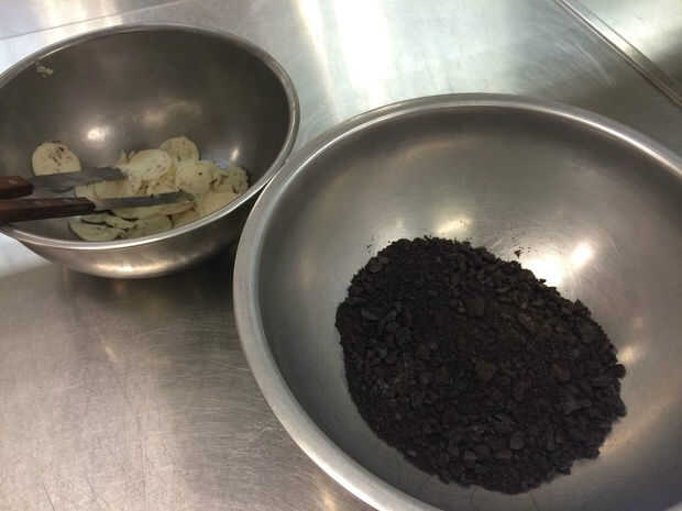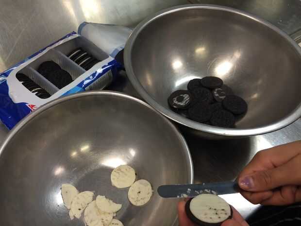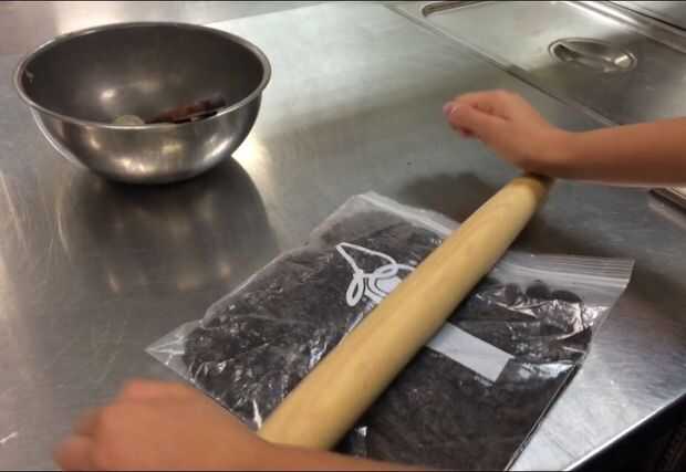 • Quitar la crema de galletas Oreo y aplastar para desmoronarse.