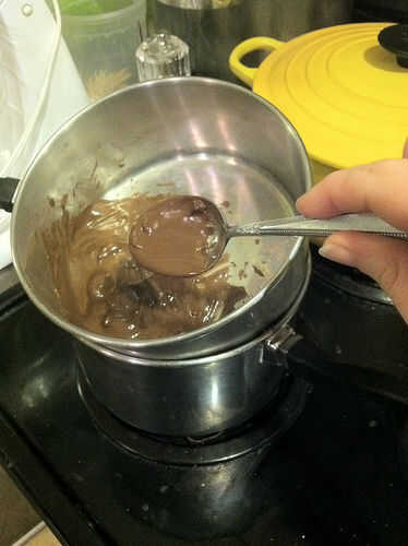 Usted puede derretir a baño María (o una marca como mina - cambiar de puesto una olla encima de otra olla, la parte inferior con cerca de dos pulgadas de agua hirviendo), o se puede derretir en definitiva estalla en el microondas (30 segundos, remover, 30 segundo, revolver, etc. hasta que se derritan). Acaba de obtener una buena consistencia líquida.