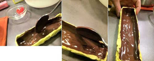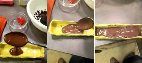 Luego Vierta en un chocolate. Cubrir el fondo del molde y luego utilice el reverso de la cuchara para obtener los lados del molde. No quiero ver a cualquiera del interior del molde. Está creando una cáscara que se llenará con yum.