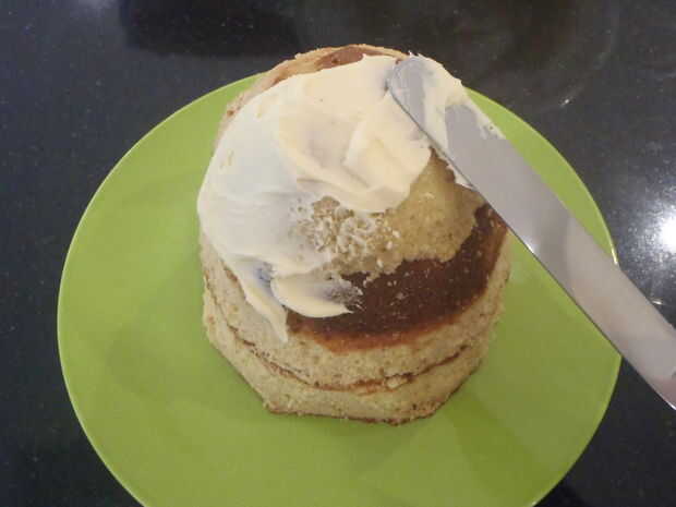 Después de colocar el pastel en su placa de presentación, aplique una capa delgada de crema en todo el pastel con una espátula.