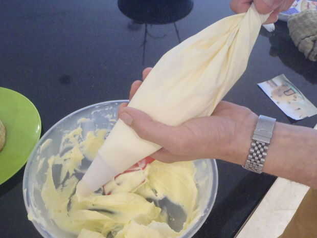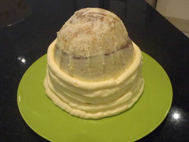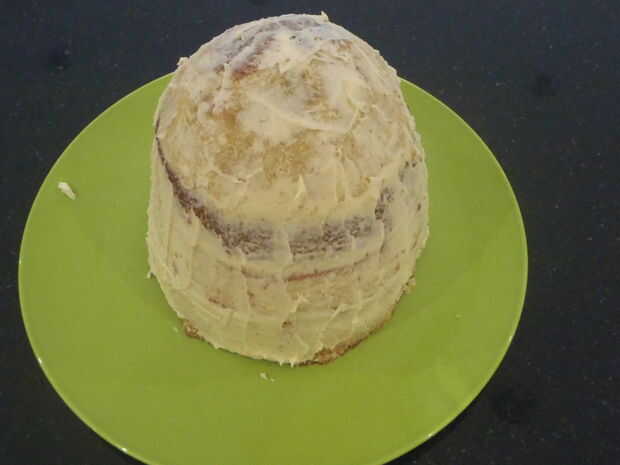 Colocar la crema restante en una manga pastelera con una boquilla de llano 2cm/3/4 ". Tubería de la formación de hielo alrededor del exterior de la torta en círculos concéntricos para crear la forma única de la colmena. Poner en la nevera para enfriar.