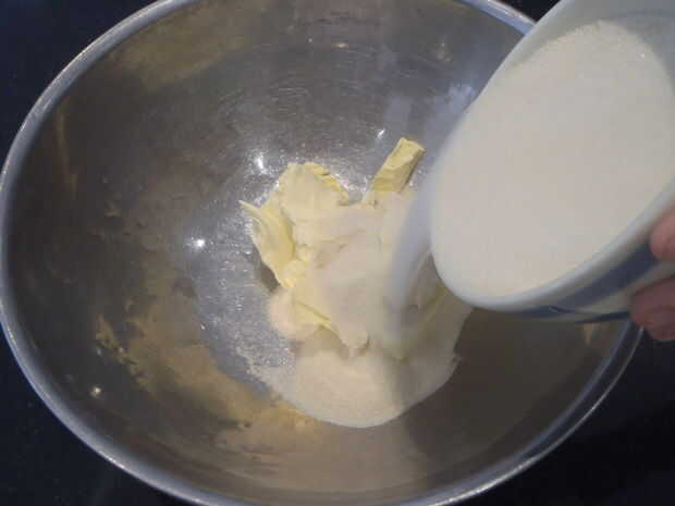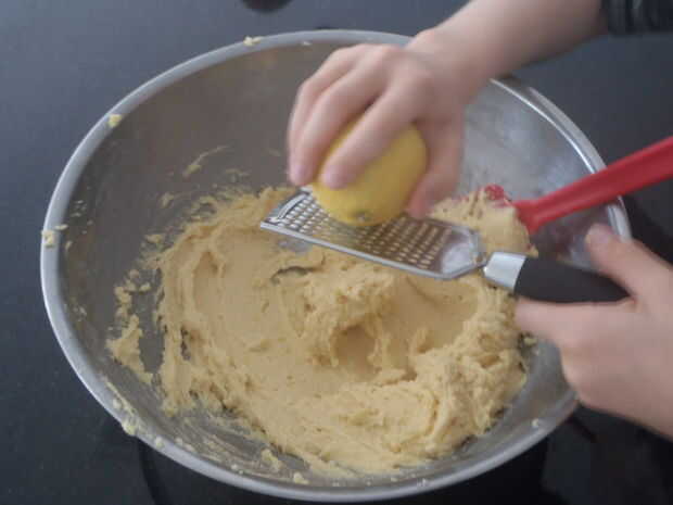 Crema de la mantequilla y el azúcar juntos hasta que se apague muy pálido, ligero y esponjoso. Luego venció en la cáscara de dos limones y la miel.