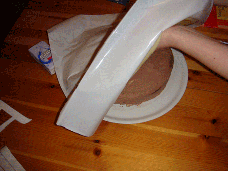 Poner el rollo de pasta de almendras sobre el pastel. El centro del rollo debe estar aproximadamente en el centro de la torta. Comprima los extremos sueltos del rollo como si quisiera exprimir algo.
