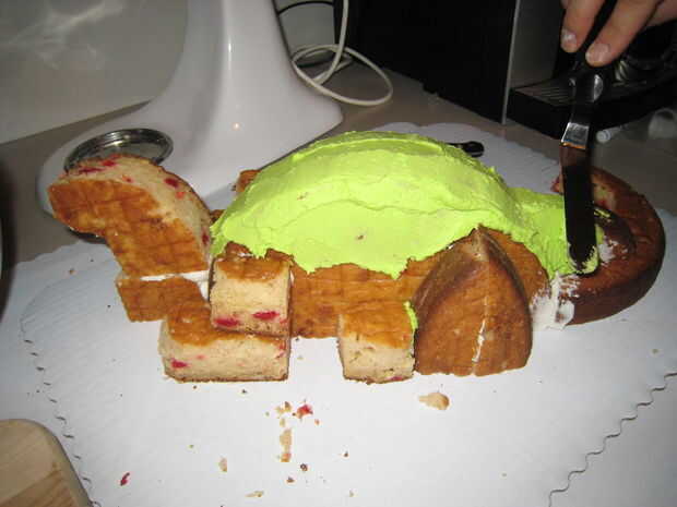 • Aplique una capa delgada de verde glaseado sobre el pastel. Esto se llama la miga capa--y con razón, como gran parte de las migajas que tire y se mezclan en el glaseado. Use una mano muy ligera en las superficies de corte de la torta. ¿Ha usado una mezcla de pastel en vez de hacer uno desde cero? ¿Son maldiciones ahora?