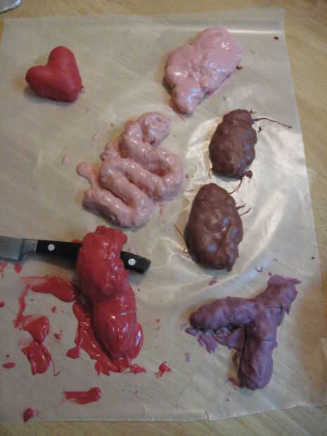 Ahora que todo ha sido seco-cupo, puede aplicarse la guinda del pastel.  Ella utiliza mantequilla crema glasé (colorante alimentario del color necesitada) y tuberías en el uso de una punta de estrella #18.  El órgano se sumergió en fusión chocolate (colores diferentes para diferentes órganos).  Los ojos eran caramelos gomosos que encontró en algún lugar.