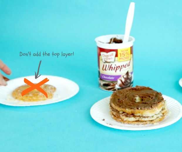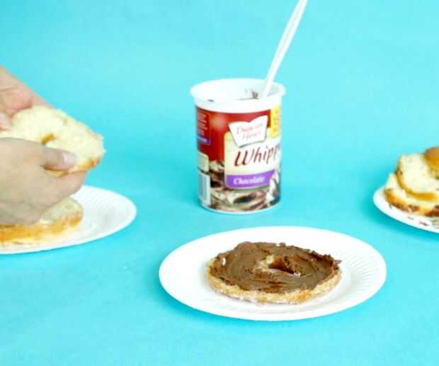 Coloque la rebanada de la parte inferior de la donut no helado, corte lateral, en una de las placas de papel.