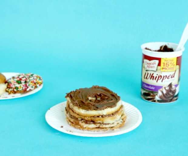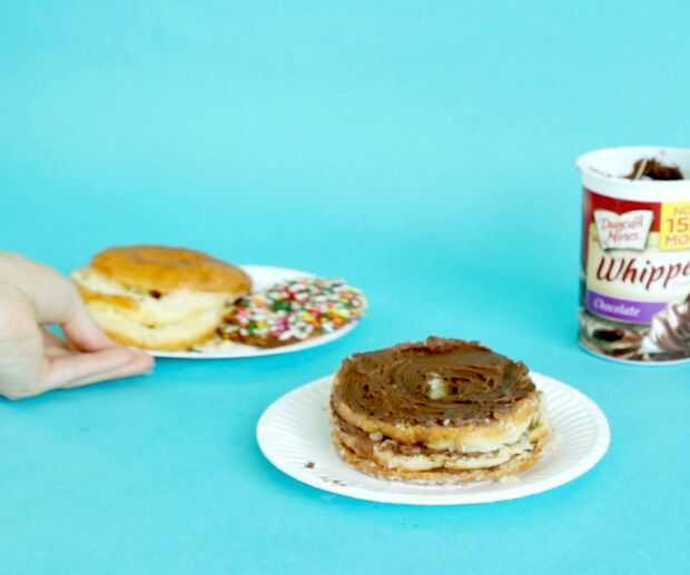 Nota: Usted no va a utilizar la rebanada inferior redondeado de la rosquilla helado. Añadir esto a la placa de snack de medianoche.