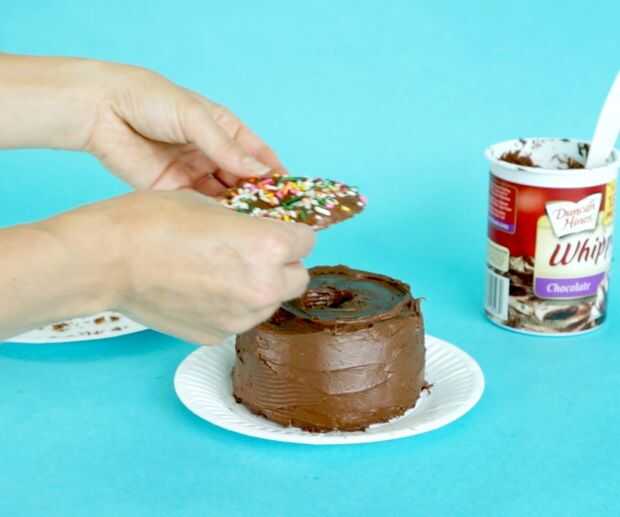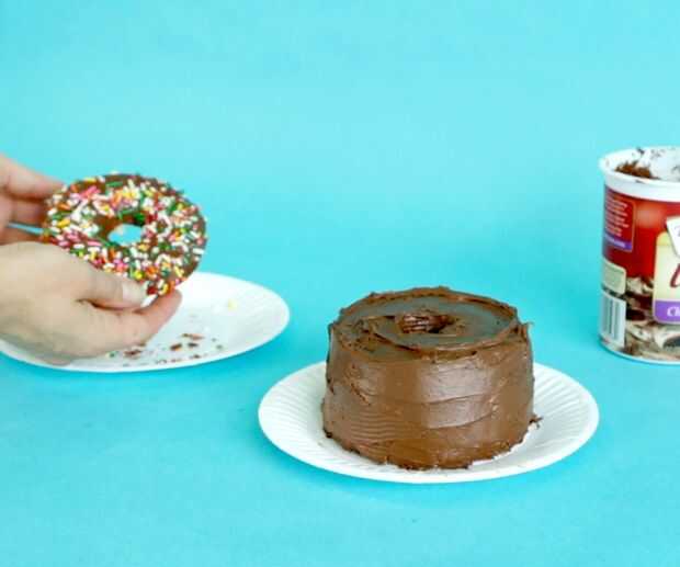 Luego tomar la parte superior de la rosquilla helado/rociado y colocarla cuidadosamente en la parte superior.