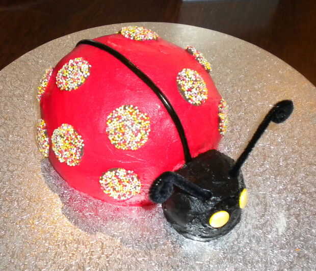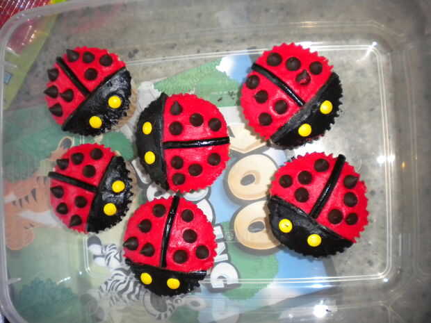 También utiliza una mezcla para pastel extra para hacer una hornada de magdalenas y les decoración como mini mariquitas que tuvimos suficiente pastel para todos.