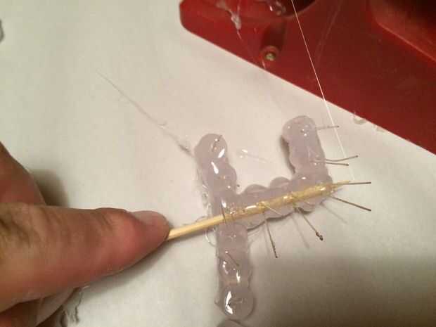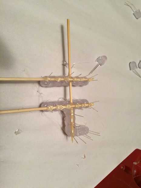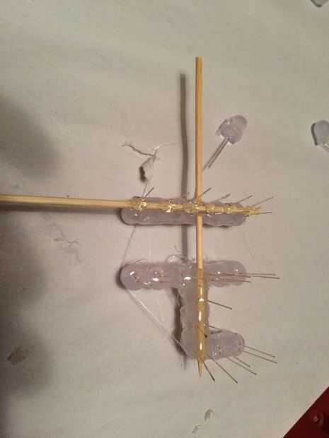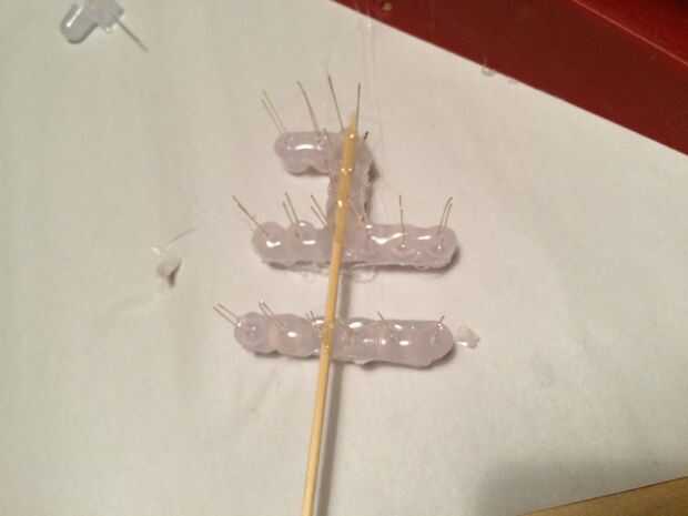 Después, reuní los números junto con cantidades copiosas de pegamento caliente del derretimiento y algunos pinchos de bambú útiles. Yo quería un travesaño al conectar los números, pero dos entradas vertical para anclar en el pastel. Una vez que el pegamento había refrescado/set, solía un par de tijeras para recorte el brocheta extra en material.