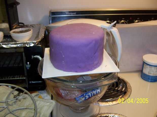 Separar el fondant en dos. Espolvorear azúcar en el tablero de potencia y una sola pieza del rodillo hasta que quede aproximadamente 1/4" espesor e incluso. Apoyar el fondant con las dos manos y cubra más de un nivel (si nunca has trabajado con fondant antes, intentar grande primero, recuerda, será cubierto con la parte superior). Trabajar lentamente y presionar ligeramente para pegar el fondant en la parte superior. Luego, alrededor de la torta, levante fondant y suave hacia abajo hasta que todo el pastel está cubierto, preferiblemente sin problemas (aunque el mío no!). Corte el exceso con un cuchillo o un cortador de pizza. Guardar los restos y reforma en una bola. Repetir para el siguiente nivel.