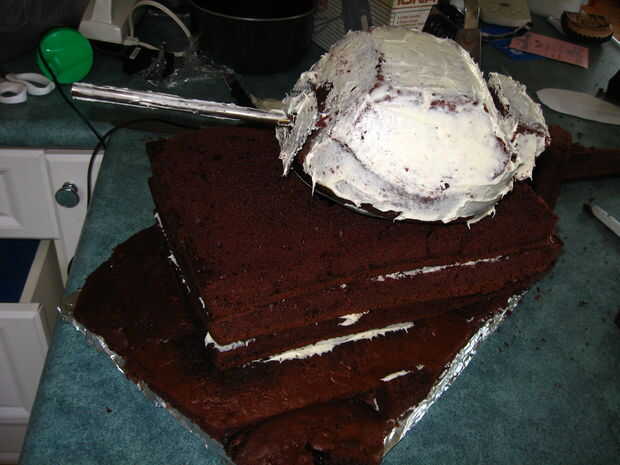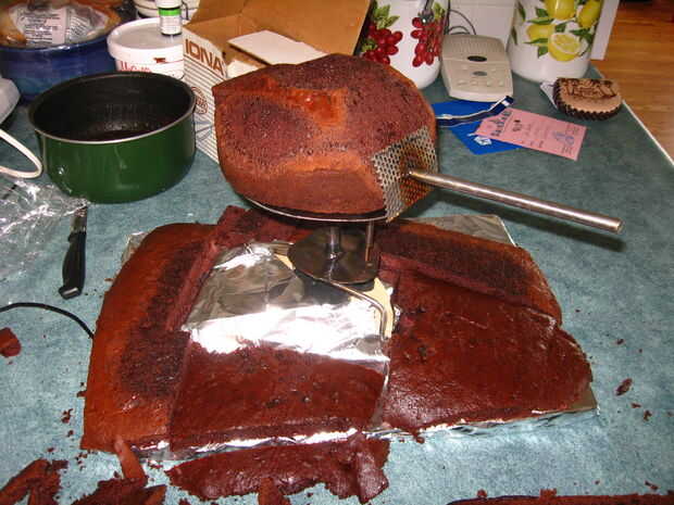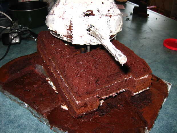 Los otros pasteles fueron horneados en un molde de 9 x 11 pulgadas. Una vez enfriado se cortó las puntas redondeadas. Estas tapas fueron utilizadas para la tierra. Las partes principales de la torta fueron talladas alrededor del mecanismo y apiladas para crear la forma áspera del tanque. Todas las piezas estaban "pegadas" junto con la formación de hielo.