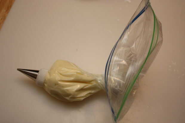 Utilice tijeras para cortar un pequeño todo en uno de los bordes inferiores para helar. Orificio depende de cuánto quieres salir!
