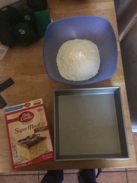 Hornear el pastel de la caja según las instrucciones en la bandeja para hornear.