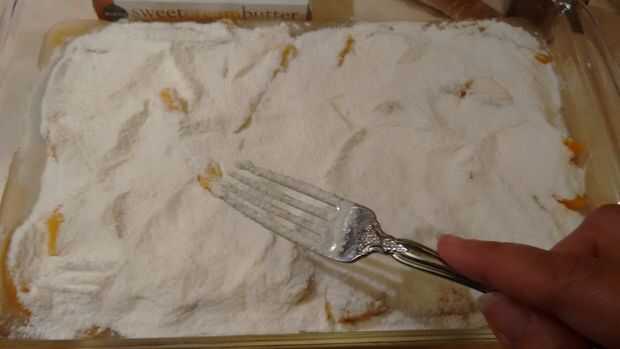 Eso es todo - volcar la mezcla de pastel sobre la fruta, como tarde como sea posible. Luego extienda más uniformemente con un tenedor o cuchillo, apisonar la mezcla hacia abajo firmemente en su capa de fruta.
