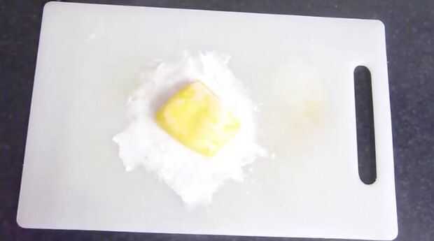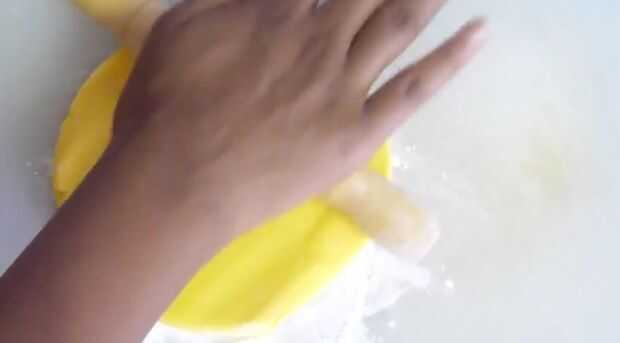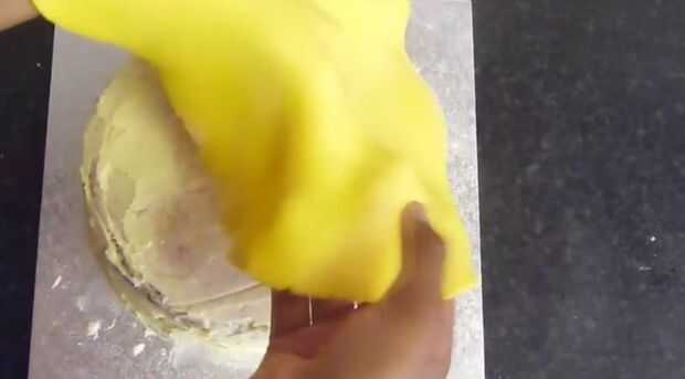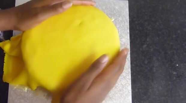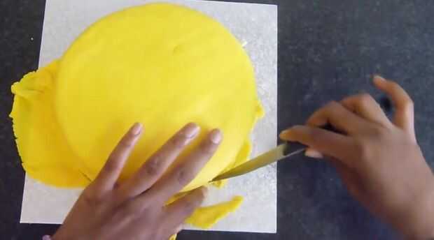 Espolvorear una superficie de trabajo con una cantidad generosa de azúcar glas (azúcar impalpable) y comenzar a estirar el fondant amarillo (listo para rodar guinda). Dependiendo del tamaño su torta (W x H) puede que necesite ajustar las medidas, pero el mejor Consejo que puedo darte es estirar el fondant de 1.5 a 2 veces más grande que la torta sí mismo. [Debe ser 1/8 de pulgada de grosor por lo que fácilmente no rip] Esto es para que tengas una capa uniforme de cubrir tu pastel de fondant. Ahora que el fondant se rueda hacia fuera, usando un rodillo grande, enrollar el fondant y cubrir la torta. Desde que rodó hacia fuera aproximadamente 2 veces más grande que usted necesita, tienes un montón de exceso. Suavizar la torta con la mano y con un cuchillo, retirar el exceso.
