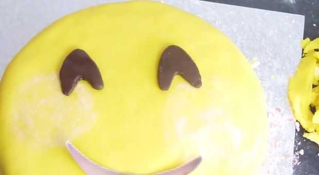 Un pincel fresco y usado no es bueno para esta receta. Utilizando un pincel, inmersión en algo de agua caliente y cepillo en la parte posterior de la pasta de azúcar y mirando un cuadro de referencia de su emoji, probar y alinear lo mejor que puede. Hacer esto con cada característica, y listo!
