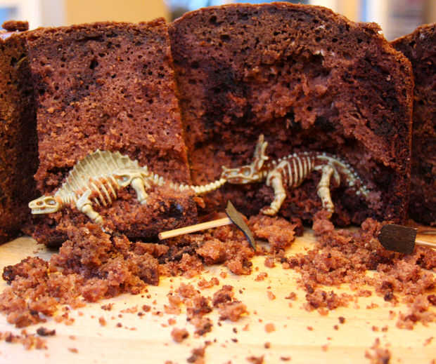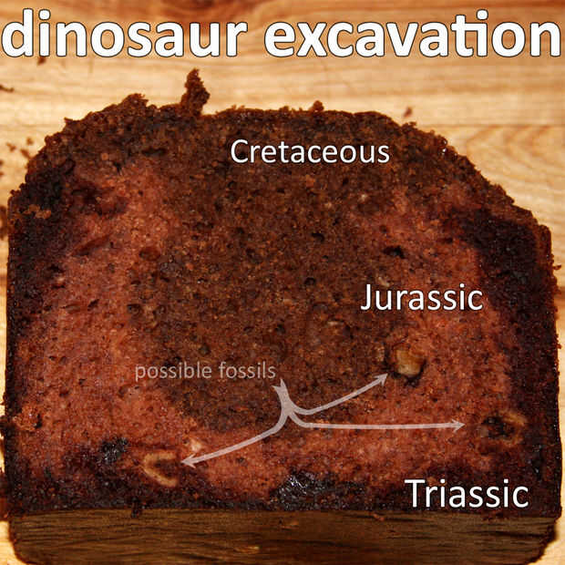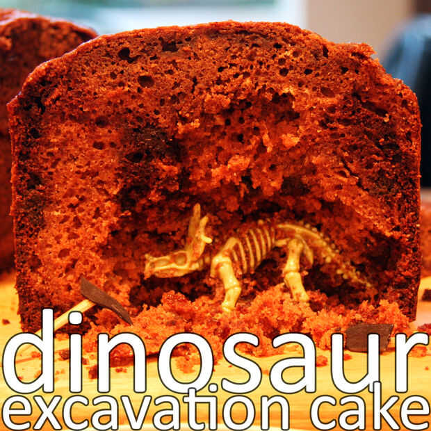 Utilizar una fuente para horno grande para crear un pastel grande, profunda, progresivamente la capa batidas de color más claros sobre fósiles de pequeño juguete dinosaurio *, luego hornear. Combinar la emoción de la excavación de dinosaurios con un sabroso pastel, celebrar con una torta de excavación dinosaurio!