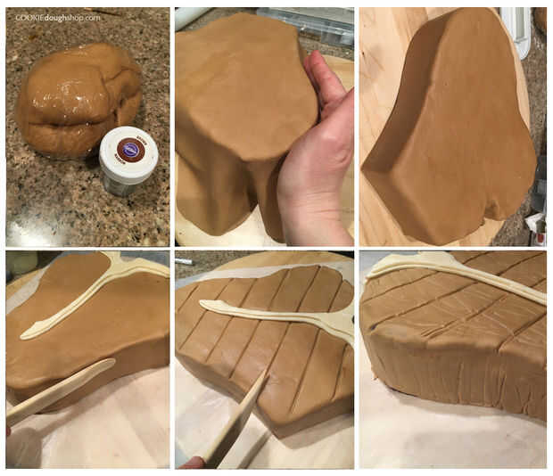 Utilizando una herramienta de escultura/cerámica usted puede conseguir en cualquier tienda de manualidades, abolladuras profundas marca diagonalmente en la superficie de la carne para crear la imitación de la red de la parrilla de marcas de quemaduras, mantenga más distancia menos incluso entre cada uno de la marca, para que se vea real. Luego, tomar la ronda parte plana de la herramienta y empuje suavemente la superficie del lado de la torta para crear la ilusión de que el lado de la carne había gritó (pérdida de líquidos) y le dan un aspecto más orgánico, en lugar de afiladas perfectos normalmente intenta lograr.