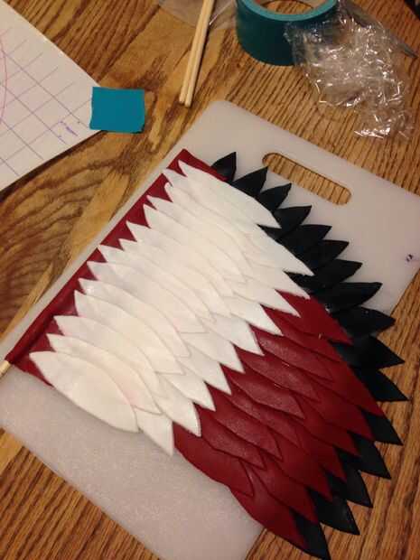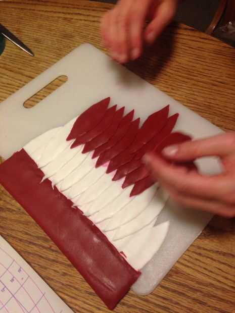 Cortar docenas de plumas de fondant utilizando nuestro cortador de galletas improvisado y cuidadosamente ensamblado les (capas de pasta de azúcar que se pega junto con una mezcla de pasta de goma y agua) en las alas para secar plano y cuelgan de un taco que se pegaría en el lado de la torta. Mucho se calculó mal el peso que seamos capaces de apoyar de esta manera, pero llegaremos a eso más adelante.