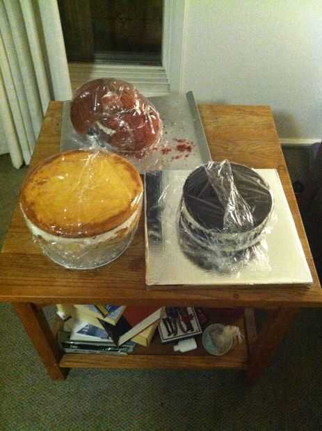Dada la cantidad de decoración que sabíamos que teníamos que subir y el tiempo que llevaría todas nuestras tartas previstas con horno cuece al horno y las limitaciones de la cacerola, decidimos hornear nuestro pastel la noche antes de la decoración. Recomiendo esto si tienes un lugar razonablemente a temperatura controlada para almacenar un montón de tarta y su receta de la torta puede soportar durante un día o menos.